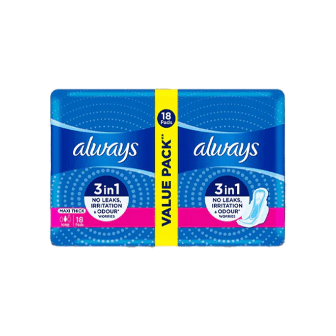 ALWAYS MAXI THICK 3 IN1 16 PADSDuring those special days when your energy is at its lowest, ALWAYS MAXI THICK 3 IN 1 16 PADS, can protect you for up to eight hours, giving you a sense of freedom and confidence. Highlights: With our innovative Mesh topsheet, Always Thicks Sanitary...