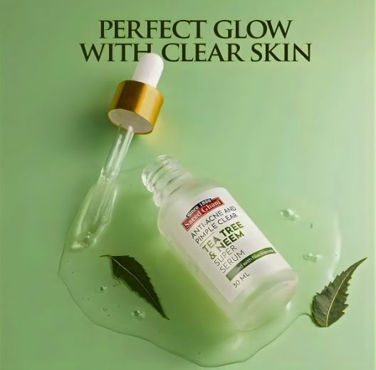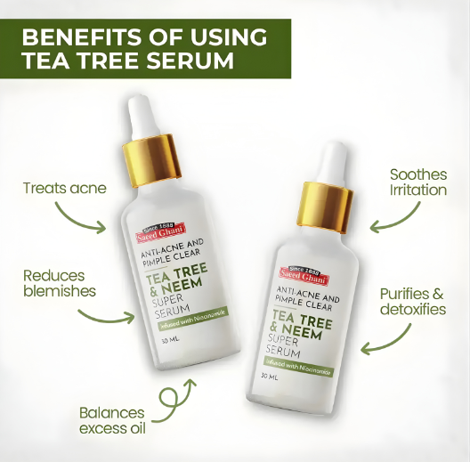 Saeed Ghani Tea Tree & Neem Super Serum 30 ml is a powerful acne treatment serum formulated to fight pimples, acne, blackheads, and excess oil. Infused with tea tree oil and neem extract, this clarifying serum provides antibacterial, anti-inflammatory, and oil-control benefits, helping to calm irritated skin and prevent future breakouts.