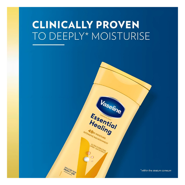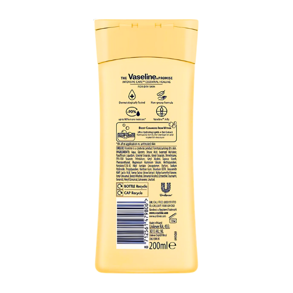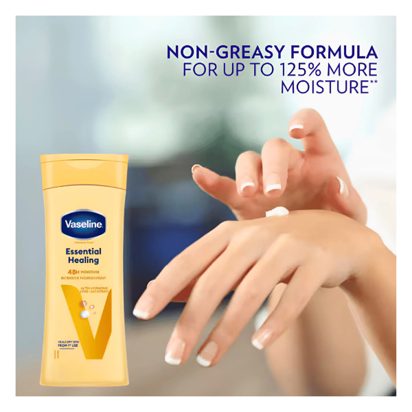 Restore your skin’s natural glow with Vaseline Essential Healing Lotion 200 ml, a fast-absorbing, non-greasy body lotion that delivers deep hydration and promotes healthy, smooth skin. Enriched with micro-droplets of Vaseline Jelly and glycerin, this lotion is specially formulated to heal dry skin from within and keep it moisturized for up to 24 hours.